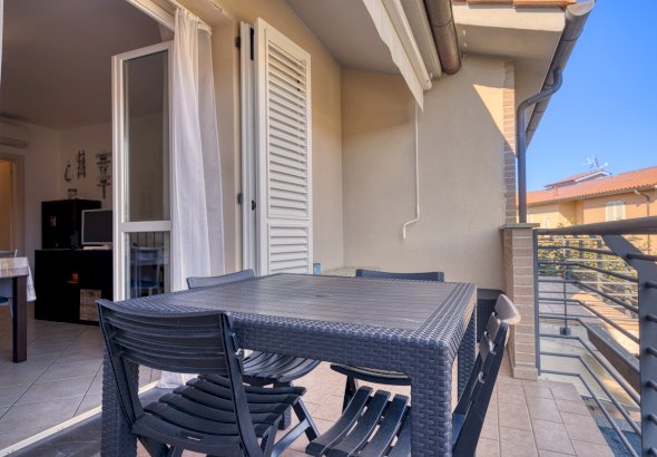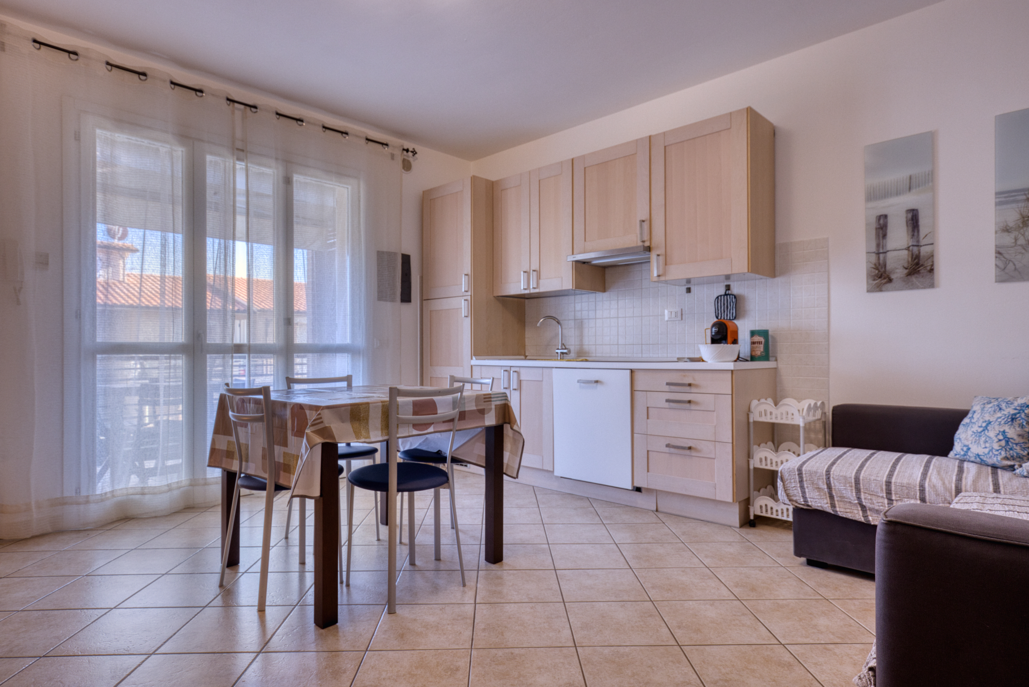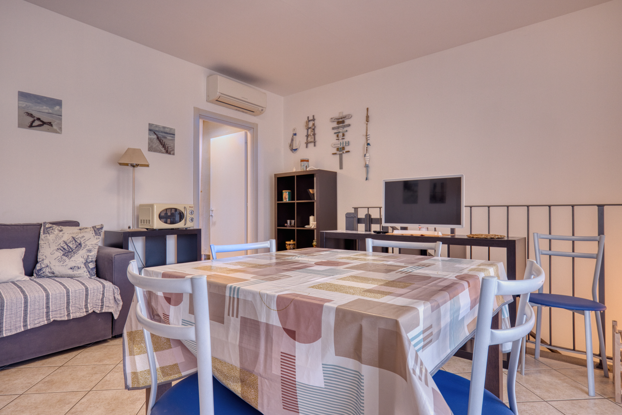 Ben arredato, è così composto: accesso indipendente da scala interna con cancellino per sicurezza bambini, soggiorno con angolo cottura e divano letto a due posti, piano a induzione, lavastoviglie, frigorifero con freezer, microonde e tv.