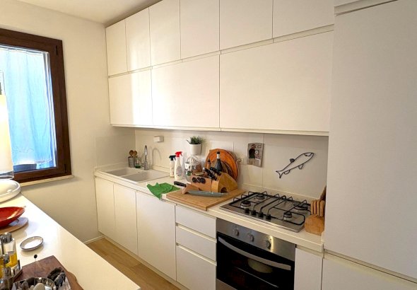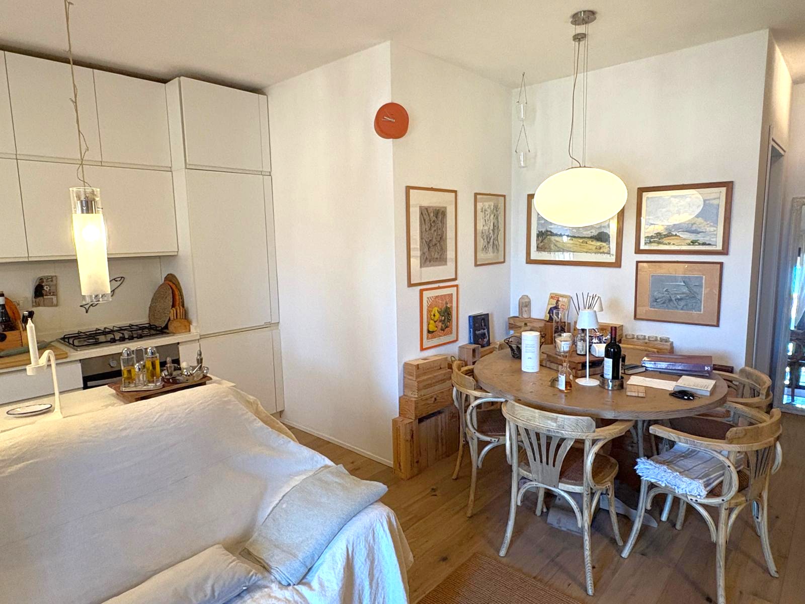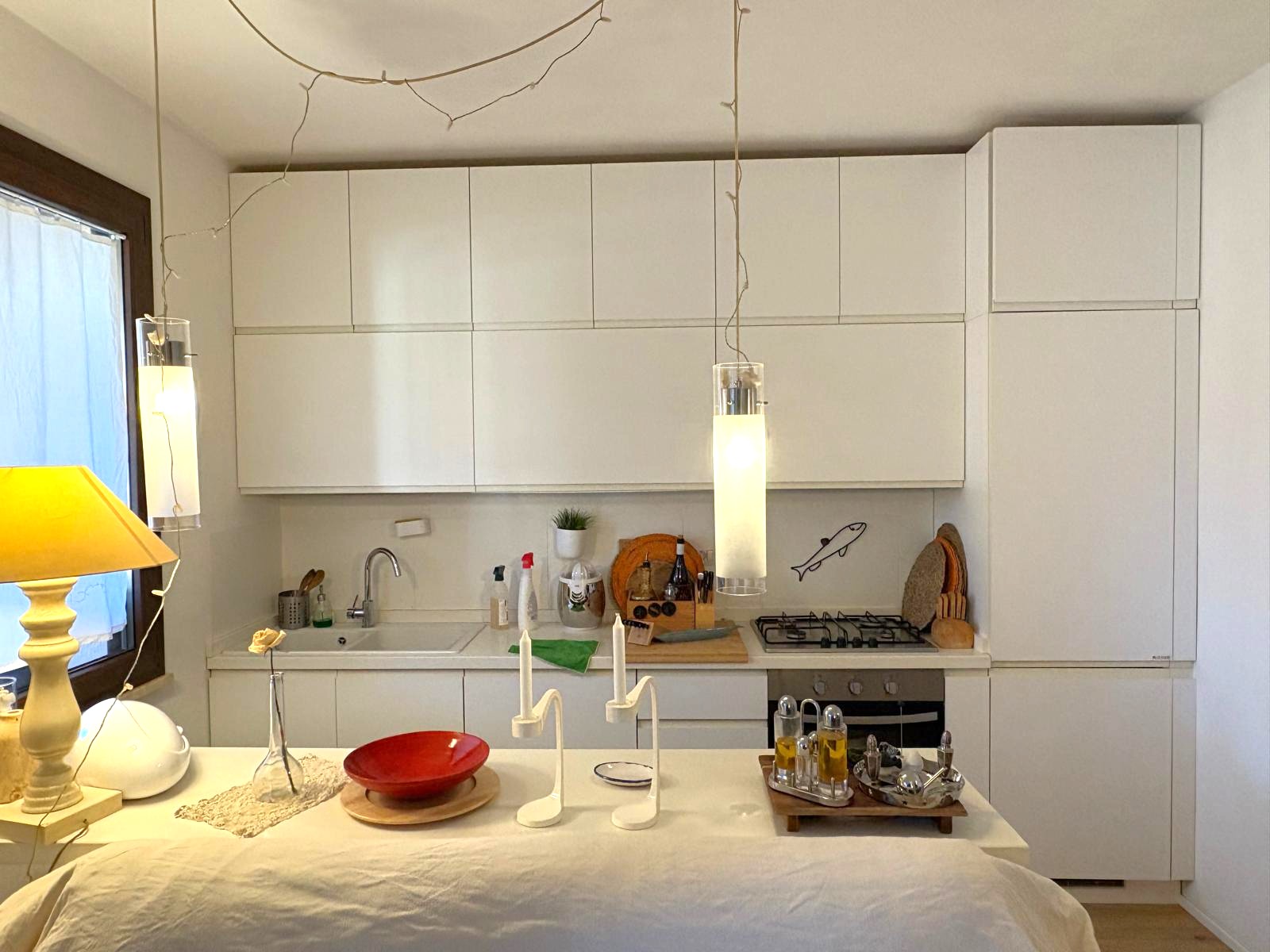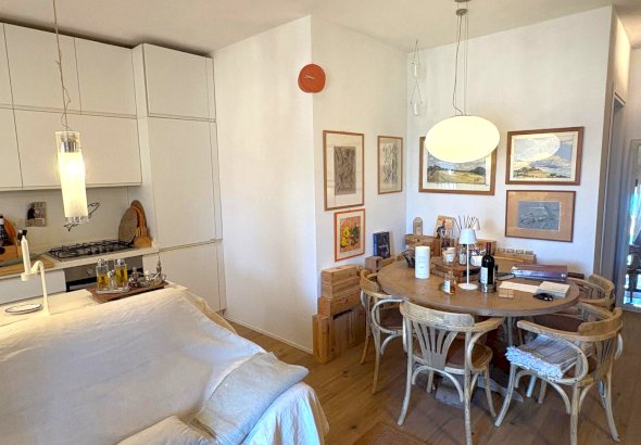 L'appartamento ha un spazioso soggiorno con cucina a vista da cui si accede direttamente alla terrazza ideale per mangiare all'aperto.