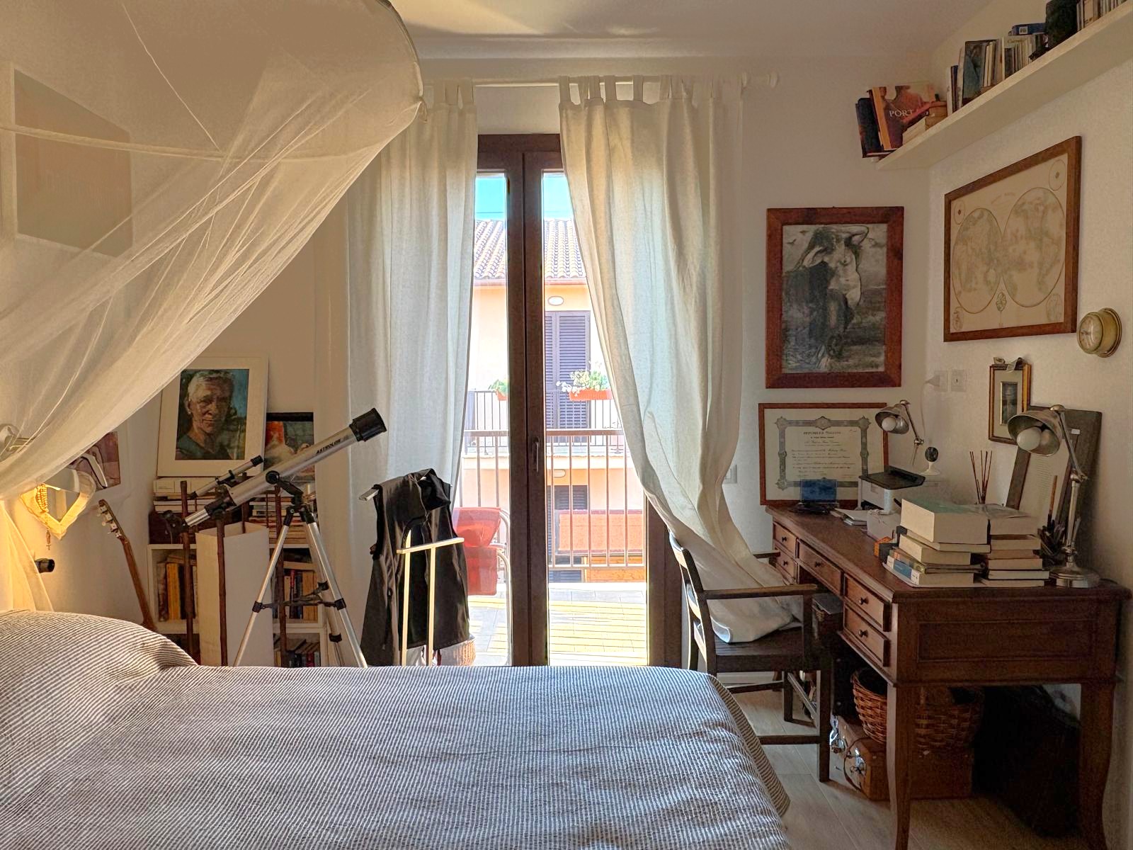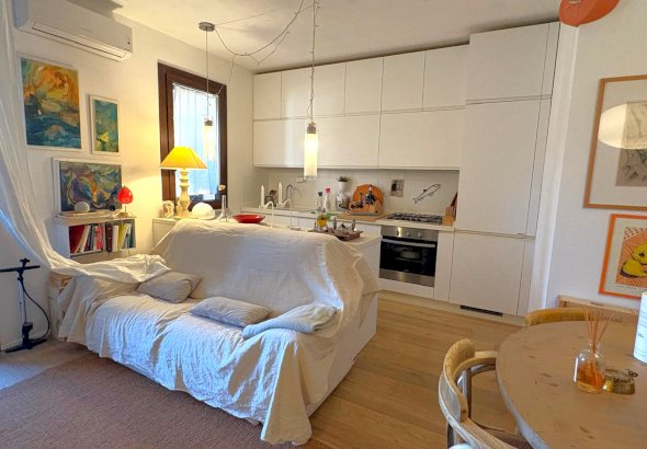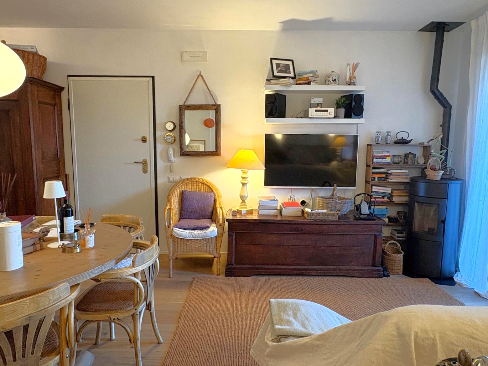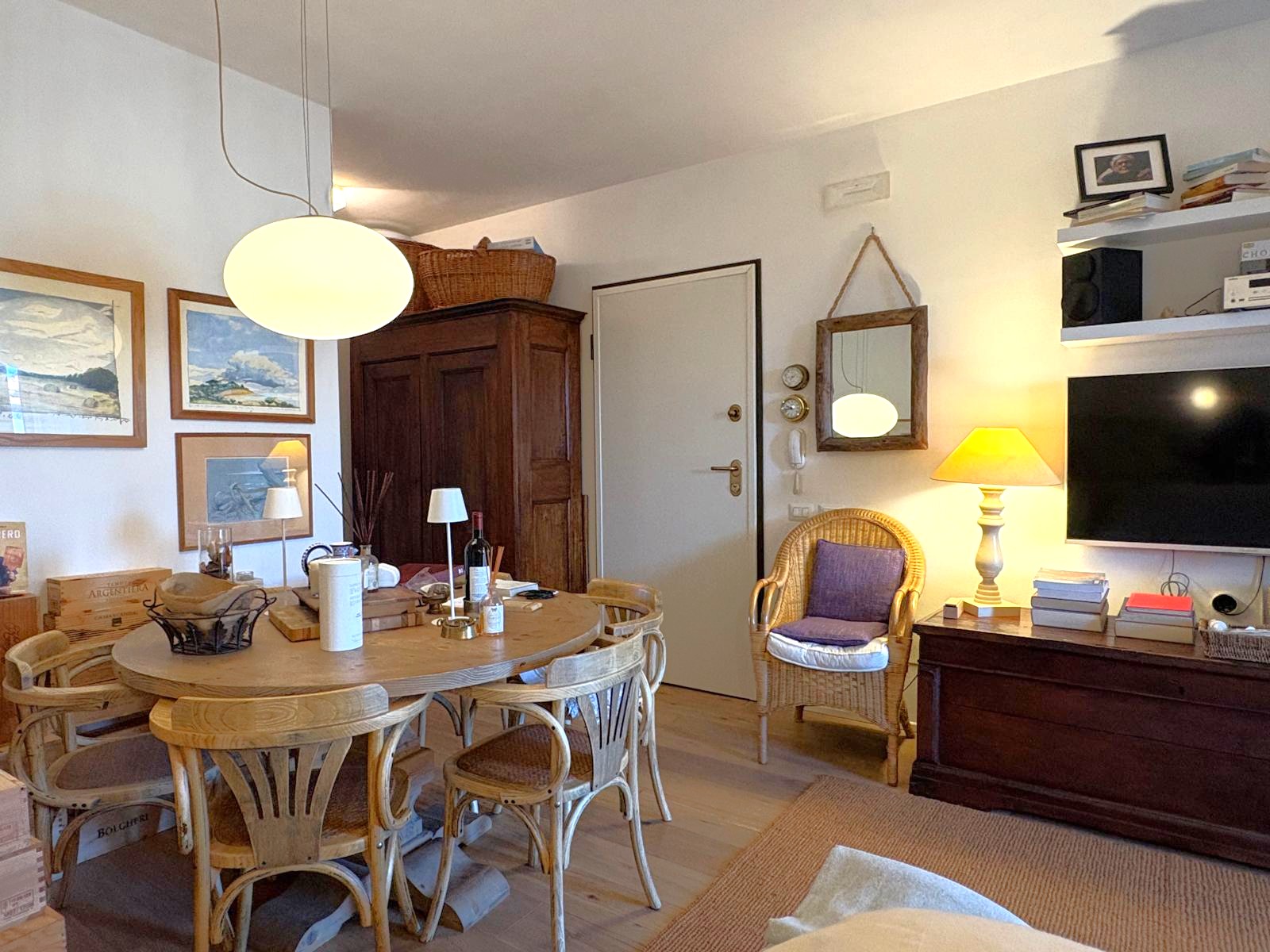 L'appartamento ha un spazioso soggiorno con cucina a vista da cui si accede direttamente alla terrazza ideale per mangiare all'aperto.