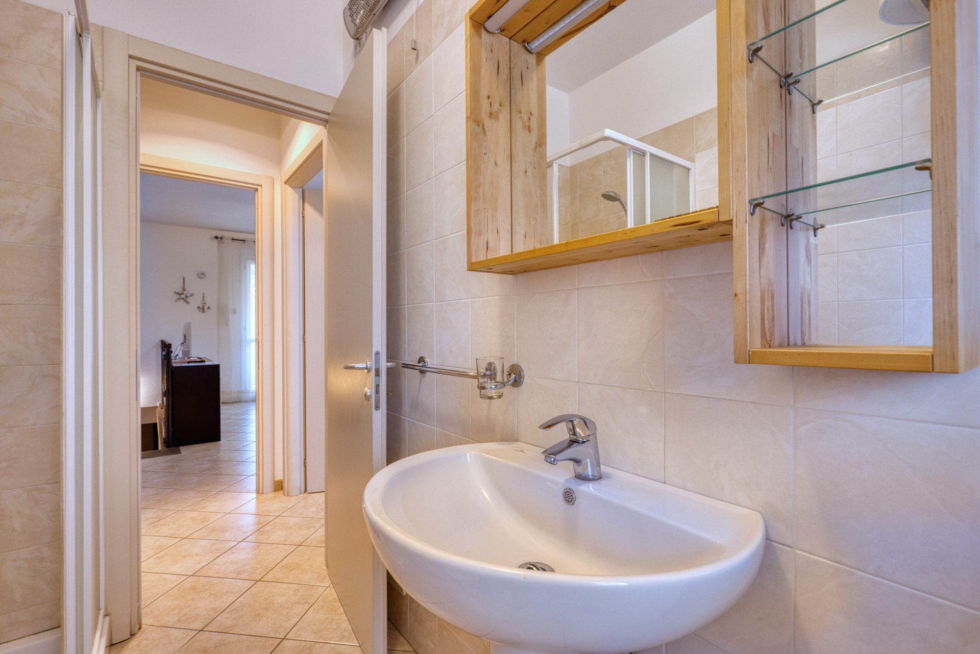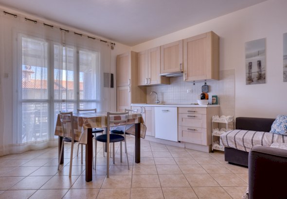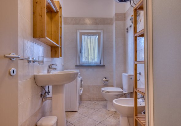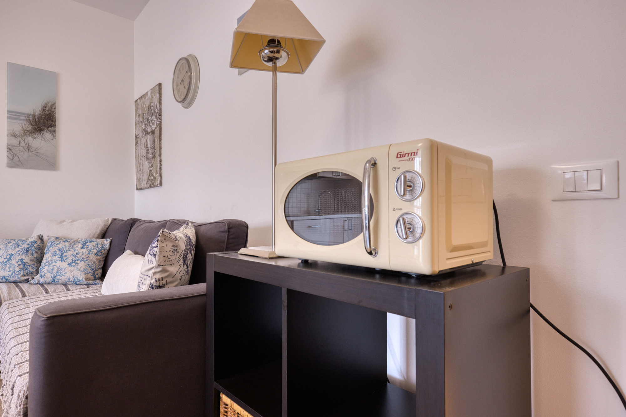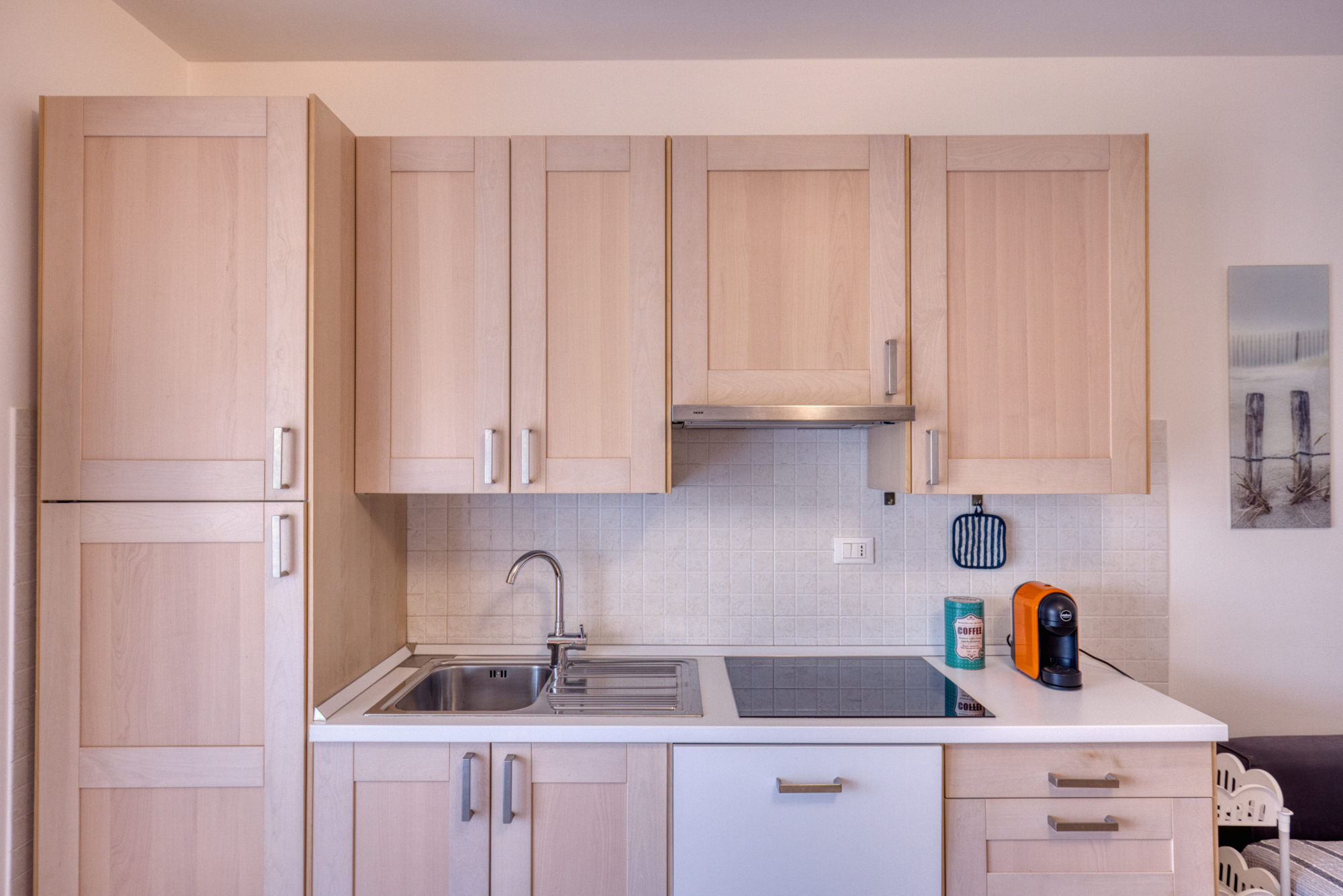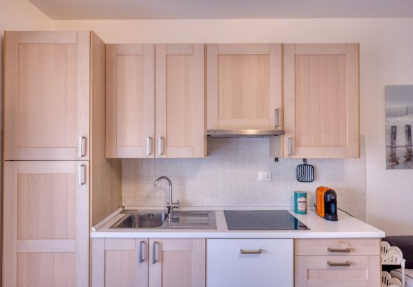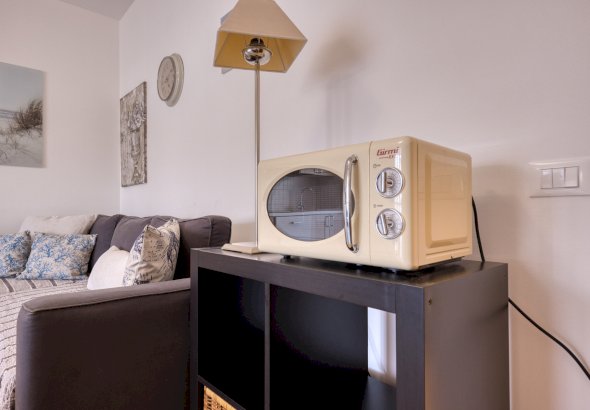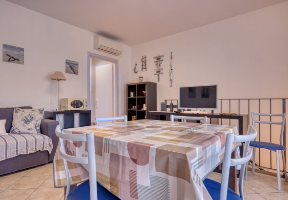 Ben arredato, è così composto: accesso indipendente da scala interna con cancellino per sicurezza bambini, soggiorno con angolo cottura e divano letto a due posti, piano a induzione, lavastoviglie, frigorifero con freezer, microonde e tv.