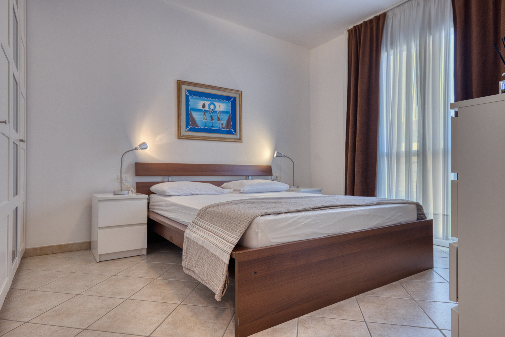 Camera con letto matrimoniale, bagno finestrato con doccia e lavatrice.