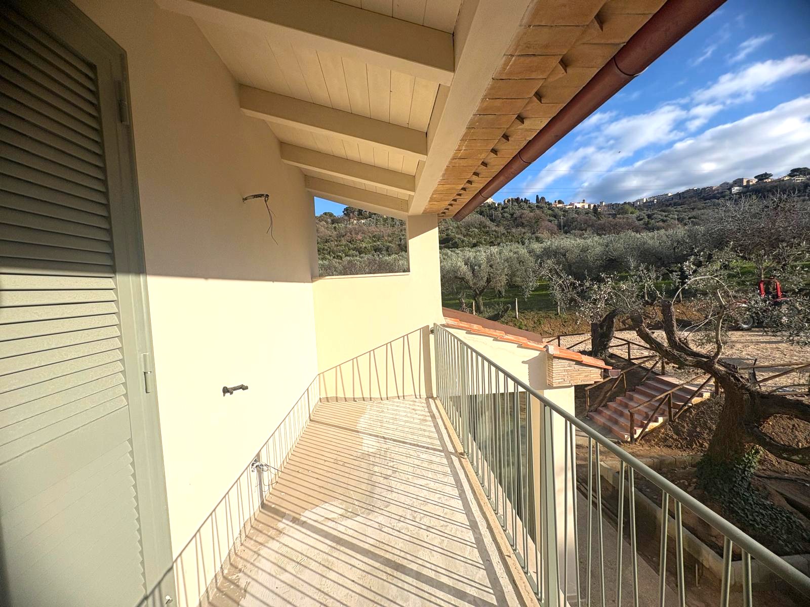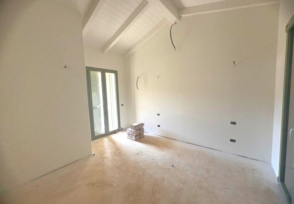Il primo piano ospita una camera matrimoniale con balcone panoramico, da cui si ammirano il mare e la futura piscina, oltre a un ampio spazio mansardato da usare come stanza per gli ospiti, guardaroba o area bimbi, e un secondo bagno elegante e moderno.
