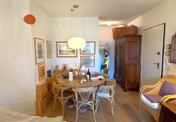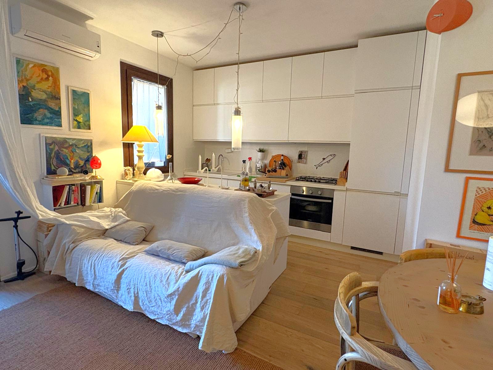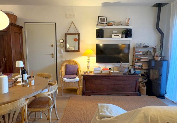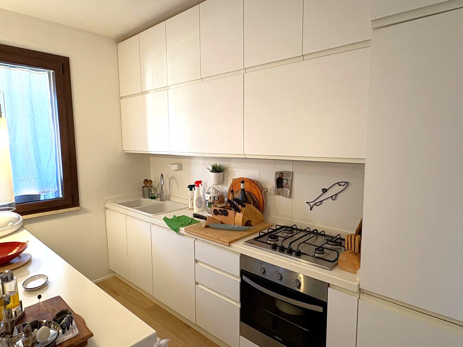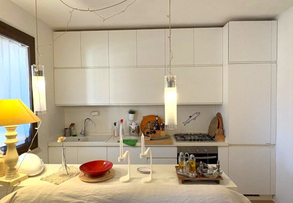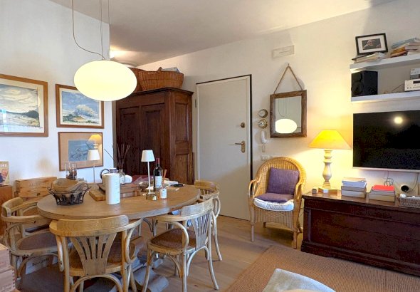 L'appartamento ha un spazioso soggiorno con cucina a vista da cui si accede direttamente alla terrazza ideale per mangiare all'aperto.