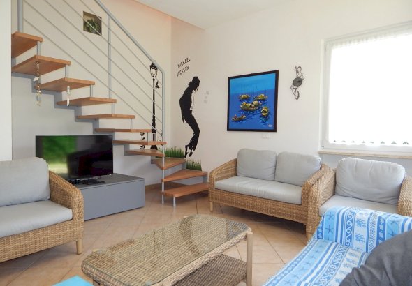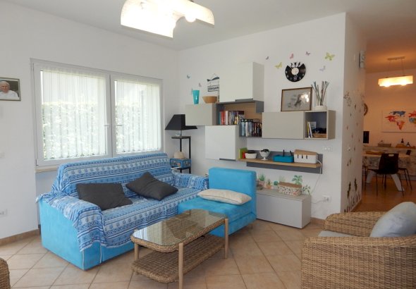 si sviluppa su due livelli e al piano terra accoglie con un luminoso soggiorno,